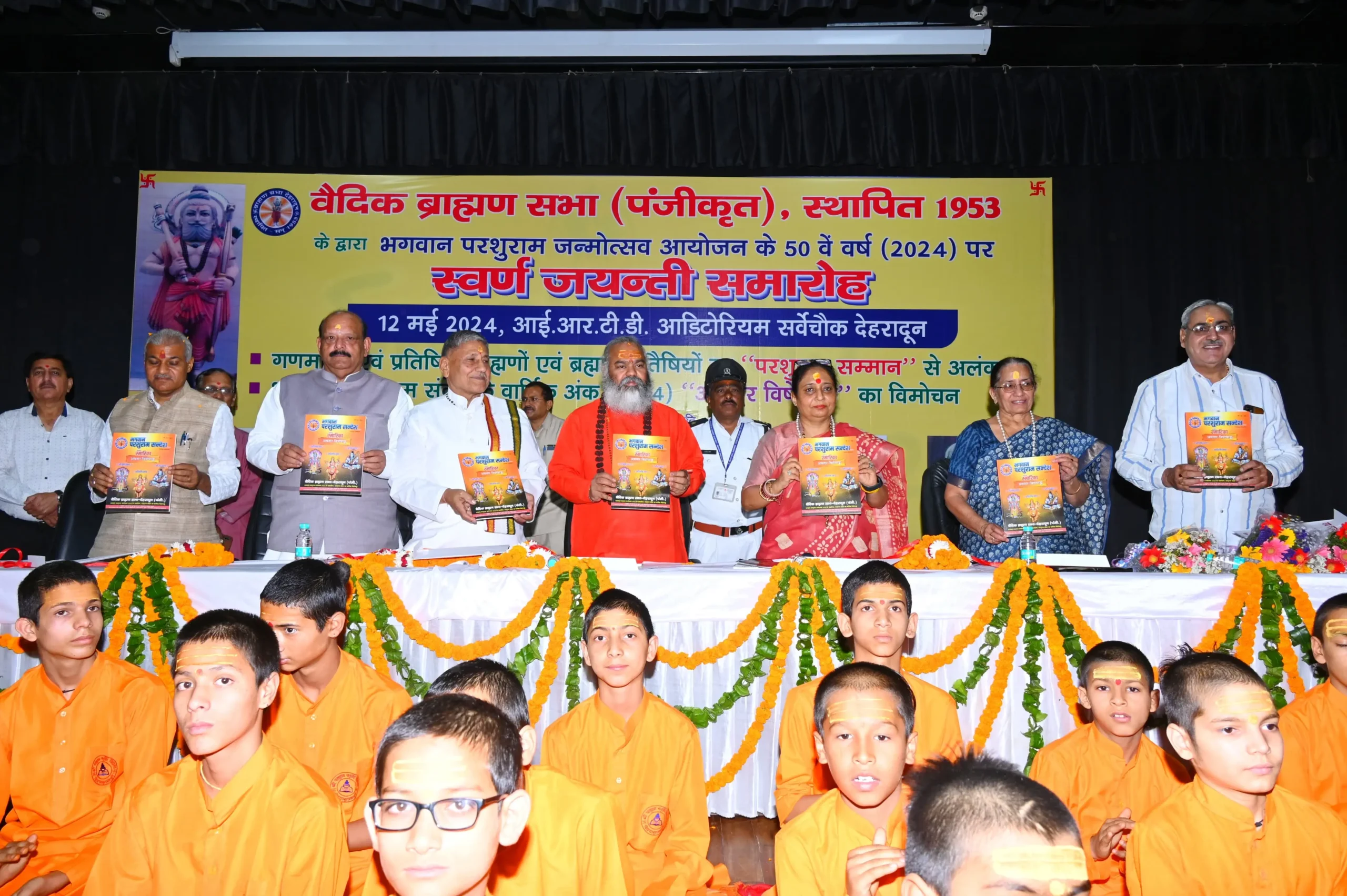 देहरादून १२ मई : तीन चरणों में आयोजित भगवान परशुराम जन्मोत्सव का स्मारिका विमोचन एवं गणमान्य ब्राह्मणों को ” श्री परशुराम सम्मान से अलंकृत करके वैदिक ब्राह्मण सभा ने किया ५० वें परशुराम जन्मोत्सव समारोह का समापन। समारोह की अध्यक्षता श्री १०८ महन्त कृष्णागिरि जी महाराज ने की। मुख्य अतिथि उत्तराखंड विधानसभा की अध्यक्ष श्रीमती खण्डूरी भूषण जी थी जिनके व्दारा गणमान्य ब्राह्मणों को ” परशुराम सम्मान से अलंकृत किया गया। मंच पर राष्ट्रपति से सम्मानित आचार्य (डा) ओमप्रकाश भट्ट जी के साथ श्रीमती सविता कपूर विधायक देहरादून कैंट, श्री सुनील उनियाल गामा जी,‌पं लाल चंद शर्मा जी एवं‌श्री अनिल नंदा जी विराजमान रहे। ५० लोगों को समाज के विभिन्न क्षेत्रों से आमंत्रित किया गया था श्री परशुराम सम्मान से अलंकृत करने के लिए। ” अवतार विशेषांक” स्मारिका विमोचन के समय आई आर टी डी आडिटोरियम खचा-खच भरा हुआ था और लोग खड़े भी थे । कार्यक्रम प्रातः १० बजे प्रारंभ हो कर दोपहर १.३० बजे शांति पाठ के साथ समापित हुआ। तत्पश्चात समष्टि भंडार हुआ। कार्यक्रम का संचालन सभा के संयोजक श्री ओमप्रकाश वशिष्ठ जी ने किया। इस कार्यक्रम में उत्तराखंड से बाहर ४ राष्ट्रीय ब्राह्मण सभाओं के प्रतिनिधि गोरखपुर,मेरठ, दिल्ली और जम्मू-कश्मीर से पधारे।